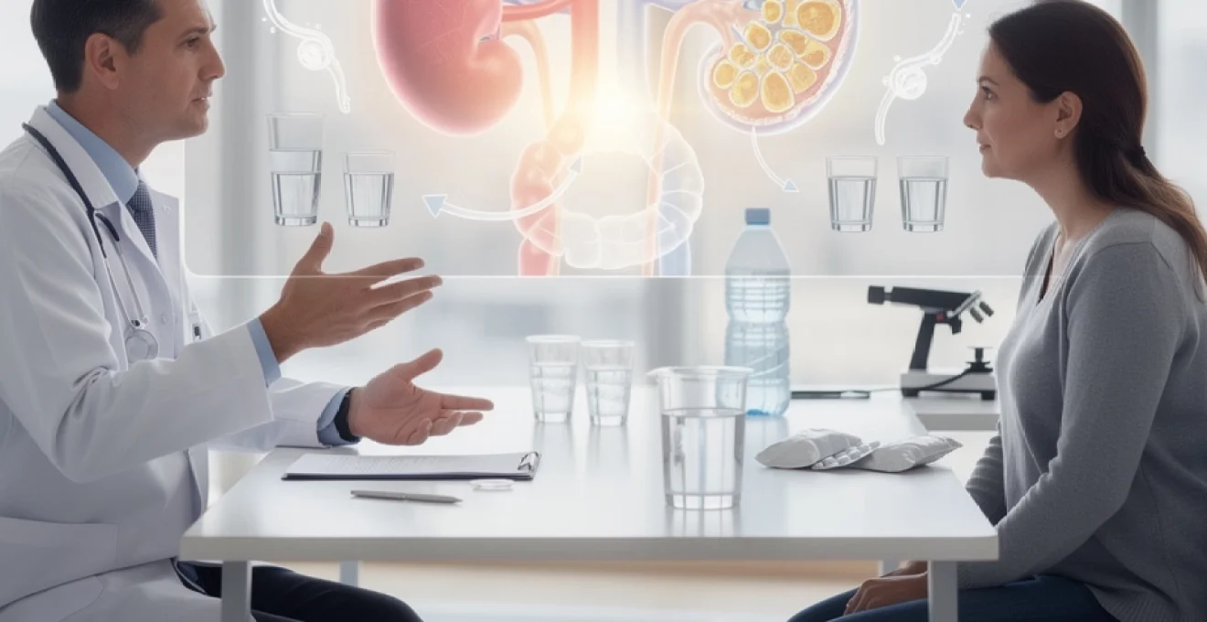 Cliniquement, le patient peut remarquer que ses urines deviennent plus claires et plus abondantes la nuit (nycturie), malgré une consommation de liquides stable. À un stade plus avancé, cette perte de pouvoir de concentration s’accompagne de rétention de toxines (urée, créatinine), d’anémie et de troubles osseux. La surveillance régulière de la fonction rénale (créatininémie, débit de filtration glomérulaire estimé) est donc essentielle si vous présentez une polyurie inexpliquée avec urines peu colorées.